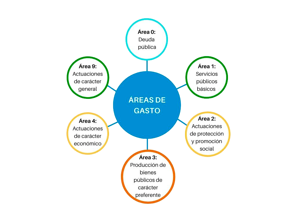 Las áreas de gasto integran políticas de gasto, y estas a su vez grupos de programas y finalmente programas. Los programas presupuestarios integran conjuntos de créditos destinados a la misma finalidad. Las áreas de gasto son las siguientes.